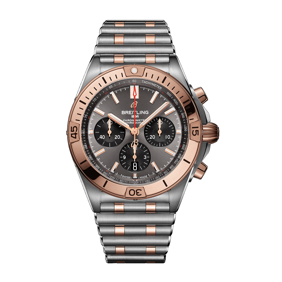ステンレススチールや18Kレッドゴールドをはじめ、種々なケース素材を揃えたクロノマットの特徴は、42ミリケースと4カ所にライダータブを配したアイコニックなベゼル。ダイアルには、ブラック、ブルー、シルバー、コッパーの各カラーをご用意。どのバージョンにも、独特な「ルーロー」ブレスレットがしっくりと馴染みます。クロノマットのムーブメントはCOSC公認クロノメーターのブライトリング自社開発製造キャリバー01です。