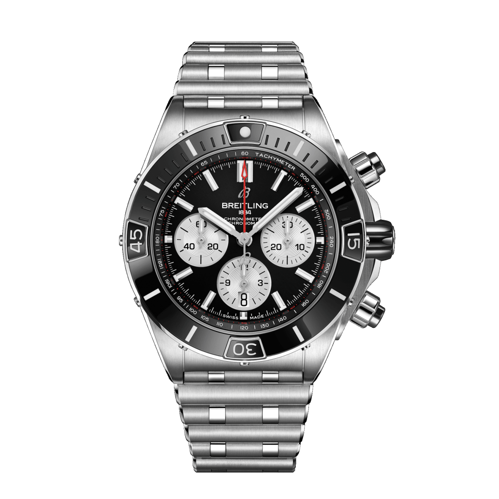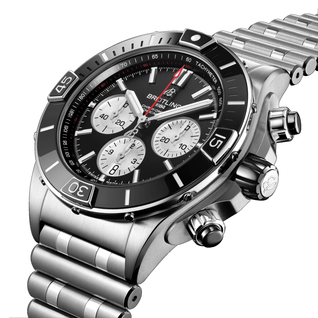 スーパー クロノマットには、ステンレススチールから18Kレッドゴールドまで、数種類のカラーとメタルのバリエーションが揃っています。アイコニックなルーロー ブレスレットまたはラバーにインスパイアされたストラップに、フォールディングクラスプがマッチしています。スーパー クロノマット B01 44は、COSC公認クロノメーターのブライトリング キャリバー01で駆動します。