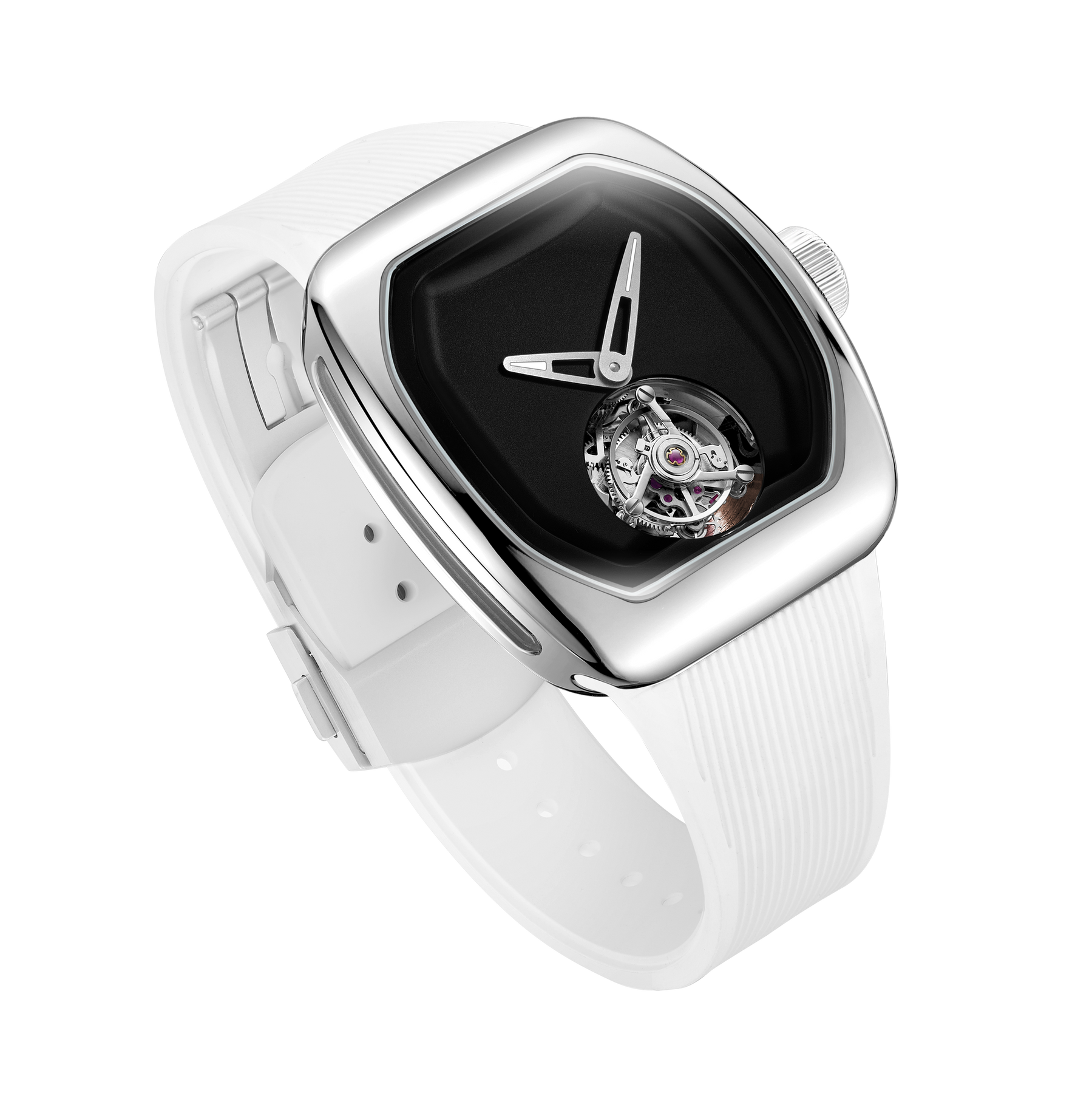 自動巻きトゥールビヨンムーブメントを採用し、ミニマルかつエレガントなデザインで
