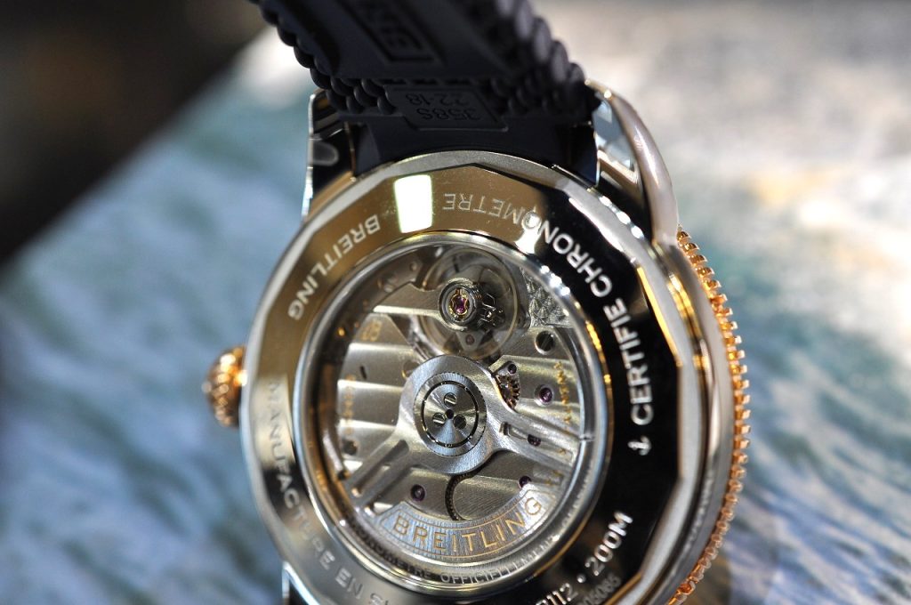 裏蓋のシースルーバック越しに収まるムーブメントは、ブライトリング初の3針自社キャリバー