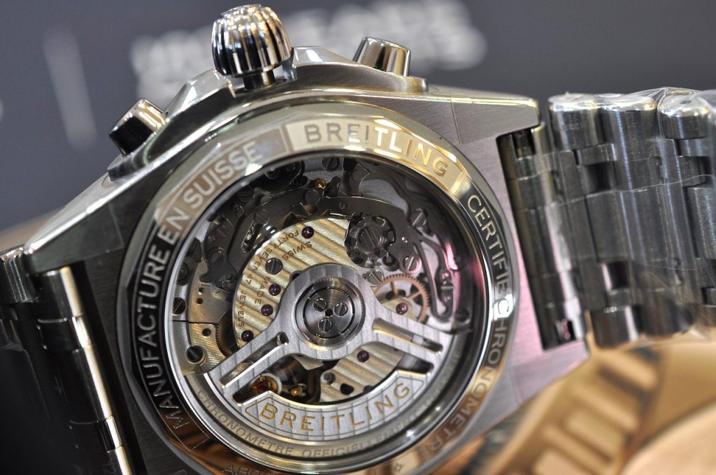 裏蓋のシースルーバック越しに収まるムーブメントはブライトリングを代表する自社製クロノグラフキャリバー