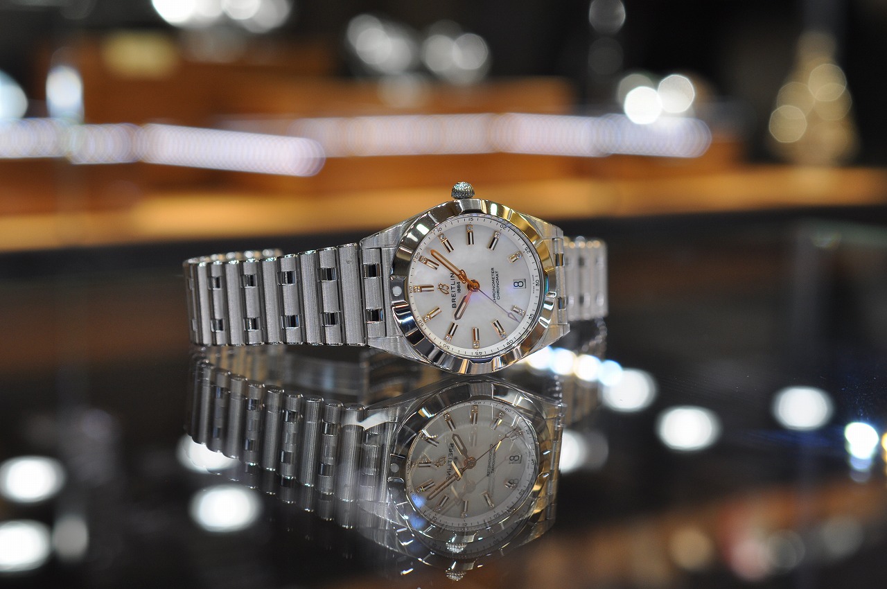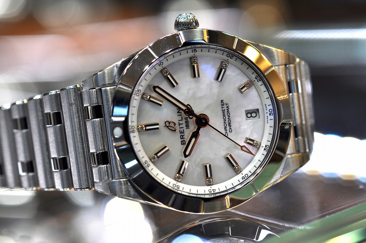 光の加減で表情を変えるマザーオブパール(MOP)のダイヤルに、ゴールドカラーの針やインデックスを