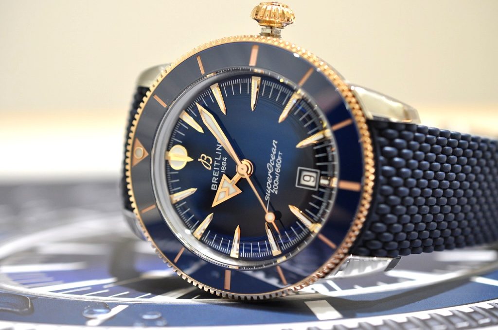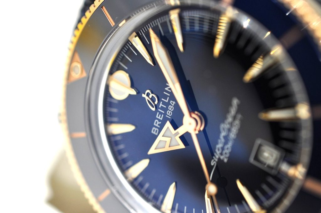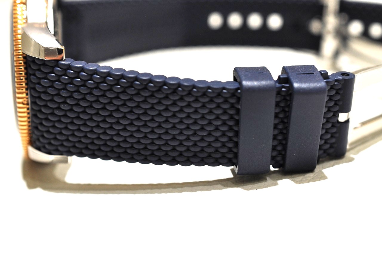 ブルーのダイヤルに温かみのある輝きが加わり、スポーティな中にエレガントさを感じさせます。
