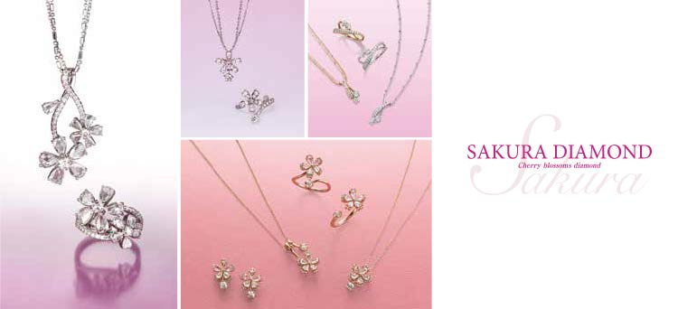 「さくらダイヤモンド』はベルギー・アントワープの熟練したカット技術により誕生し、一般的なブリリアントカットのダイヤよりもカット面が多く、繊細で優しく煌めきを演出します。ネックレス、リング、ピアス、それぞれに多彩な作品が並びます。