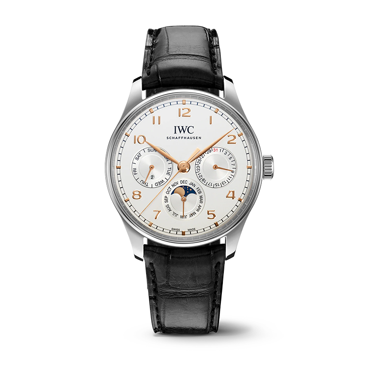 18Kレッドゴールド ケース/ケースサイズ41㎜/自動巻き/3気圧防水端正で機能的な文字盤には、アラビア数字とスレンダーなリーフ針が配置されています。1/4秒単位の目盛りをプリントした特徴的なインナーリングは、計測時間の正確な表示を可能にするだけでなく、腕に着用できる高精度の航海用計器という「ポルトギーゼ」の原点をも想起させます。このモデルには、18Kレッドゴールド製ケース、スレートカラーの文字盤、ゴールドの針およびアップライト・インデックスが採用され、ブラックのアリゲーター・ストラップが配されています。スポーティーでエレガントなクロノグラフの内部で駆動力を生み出すのが、IWC自社製キャリバー69355です。