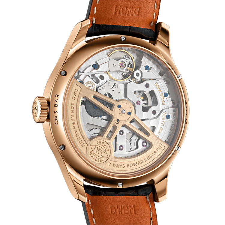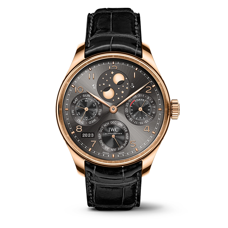 18Kレッドゴールド ケース/直径 44.2 mm/防水性 3.0 気圧「ポルトギーゼ・パーペチュアル・カレンダー」のムーンフェイズ表示は、実際の月の満ち欠けとの間に生じる差異が、577.5年でたった1日分という正確さを誇ります。ダブルムーンフェイズ表示を備え、北半球と南半球で観測できる月の姿が鏡像のように映し出されます。ムーンフェイズ表示全体が星を散りばめた夜空をなし、まるで月と星が遠い宇宙に浮かんでいるように見えます。永久カレンダー、4桁の西暦表示、ペラトン自動巻き機構を搭載した7日間自動巻きムーブメント、パワーリザーブ表示など、このエレガントなタイムピースには望みうるほぼすべての機能が揃っています。時計を駆動するのは、ソリッド・レッドゴールド製ローターとブルースティール製のビスを特徴とするIWC自社製キャリバー52000シリーズのムーブメントです。何世代にも継承でき、魅力溢れる「ポルトギーゼ・パーペチュアルカレンダー」をご案内いたします。