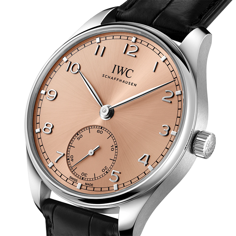 ステンレススティール ケース/直径 40.4 mm/防水性 3.0 気圧特徴的な分目盛りと6時位置のスモールセコンドを備える、すっきりと整った文字盤。1930年代末のIWCウォッチであるRef. 325が確立したクラシックなデザインは、「ポルトギーゼ」コレクションに共通する特徴として、その歴史の中で脈々と受け継がれてきました。「ポルトギーゼ・オートマティック 40」は、この時代を超えたモダンなデザインを、直径40mmの身に着けやすいケースに収めたモデルです。ステンレススティール製ケース、ロジウムメッキの針とアップライト・インデックスを採用。サーモンカラーの文字盤が目を引くデザインの特徴となっています。控えめな「ポルトギーゼ」デザインと洗練されたサンレイ仕上げにより、この色が美しく引き立っています。ウォッチには、快適な着用感を約束するバタフライ・フォールディング・クラスプが付いた、ブラックのアリゲーター・ストラップが合わせられています。IWC自社製キャリバー82200搭載。堅牢で高品質なこの自動巻きムーブメントは、耐摩耗性に優れたセラミック製のパーツをペラトン自動巻き機構に使用し、60時間のパワーリザーブを蓄えます。