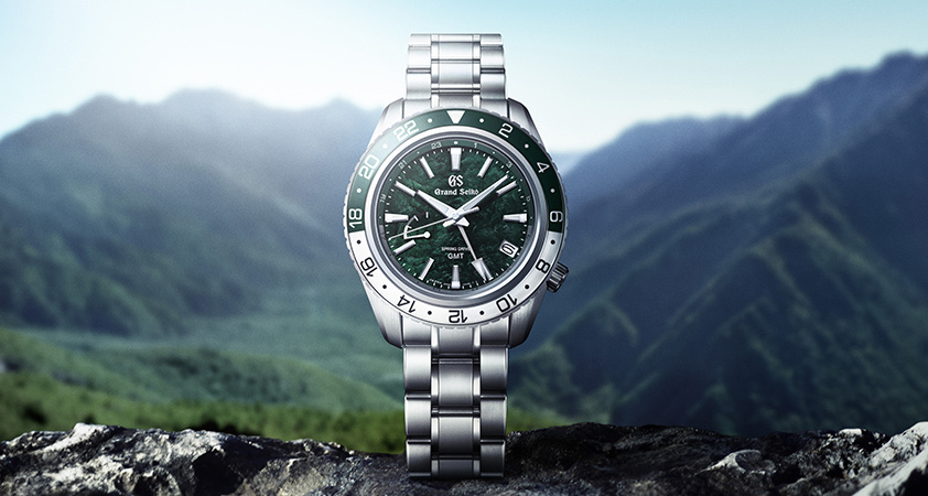 グランドセイコーのスプリングドライブウオッチは、穂高連峰を望む「信州 時の匠工房」で、熟練の職人によるハンドメイドで作られています。遥か昔の火山活動で大陸が激しく隆起して生まれた穂高連峰は、長い年月の風雪に山肌を削られてダイナミックな山岳地帯になりました。 その急峻な岩稜を表現する有機的なダイヤルパターンを施した「SBGE295」は、穂高の短い夏の鮮やかな情景から着想を得たグリーンのダイヤルが印象的なモデルです。ムーブメ ントには、GMT 機能付きのスプリングドライブムーブメント「キャリバー9R66」を搭載しています。そして、サファイアガラス製の回転ベゼルとダイヤルリングに示された 24 時間 表示によって、3つのタイムゾーンの時刻を知ることができます。