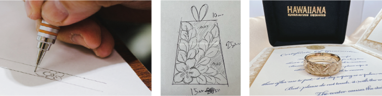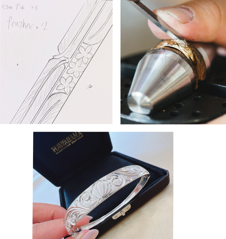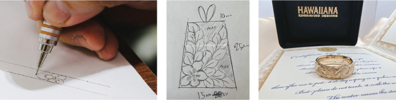 手彫り実演開催会場では、お客様のご要望や想いを伺いながら、その場でデザイン画を作成。永露氏による手彫り実演とともに、完全フルオーダーでハワイアンジュエリーをご注文いただけます。KUMUKUAIの手仕事ならではの確かな技術を、ぜひ間近でご覧ください。