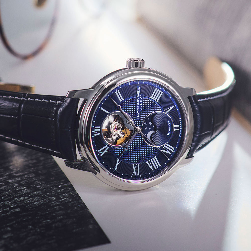 ムーンフェイズ機能とオープンワークを搭載した日本限定モデルのマエストロです。 自動巻きキャリバー・RW4280、ホワイトのローマ数字インデックス・中央の波型模様・ムーンフェイズ機能を備えたネイビーダイアルが特徴です。 2010年に誕生したマエストロは、クラシック音楽や音楽家への讃美を表現したコレクションです。スイス時計の伝統的な製造技術を受け継ぎながら、上品さと洗練されたイノベーションを融合しています。