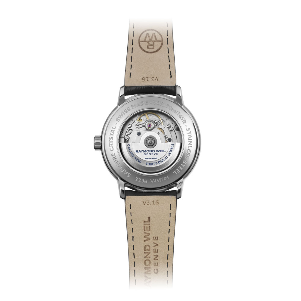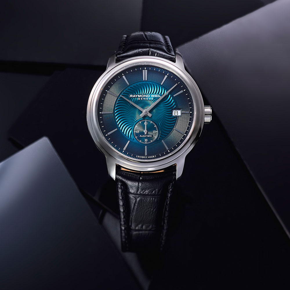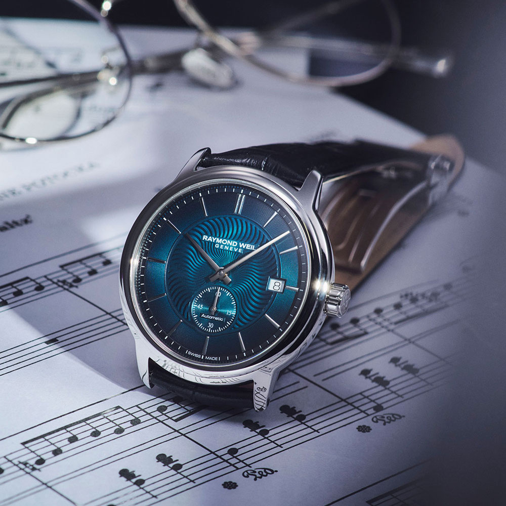 ステンレススティール製ケースにキャリバー・RW4250、濃淡のあるブルーのダイアル、シルバーのインデックスを備え、スモールセコンドを搭載しています。ダイアル中央には波型の模様が描かれ、時計に表情を与えています。 2010年に誕生したマエストロは、クラシック音楽や音楽家への讃美を表現したコレクションです。スイス時計の伝統的な製造技術を受け継ぎながら、上品さと洗練されたイノベーションを融合しています。