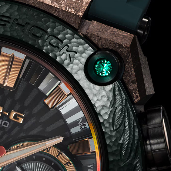 ベゼルの色は、鉄を高温で焼いた時に現れる「鐵色(くろがねいろ)」を表現。さらに、精神的な強さを与えると言われるエメラルドをベゼルのビス4箇所にセット。重厚感の中に華やかさを与えています。